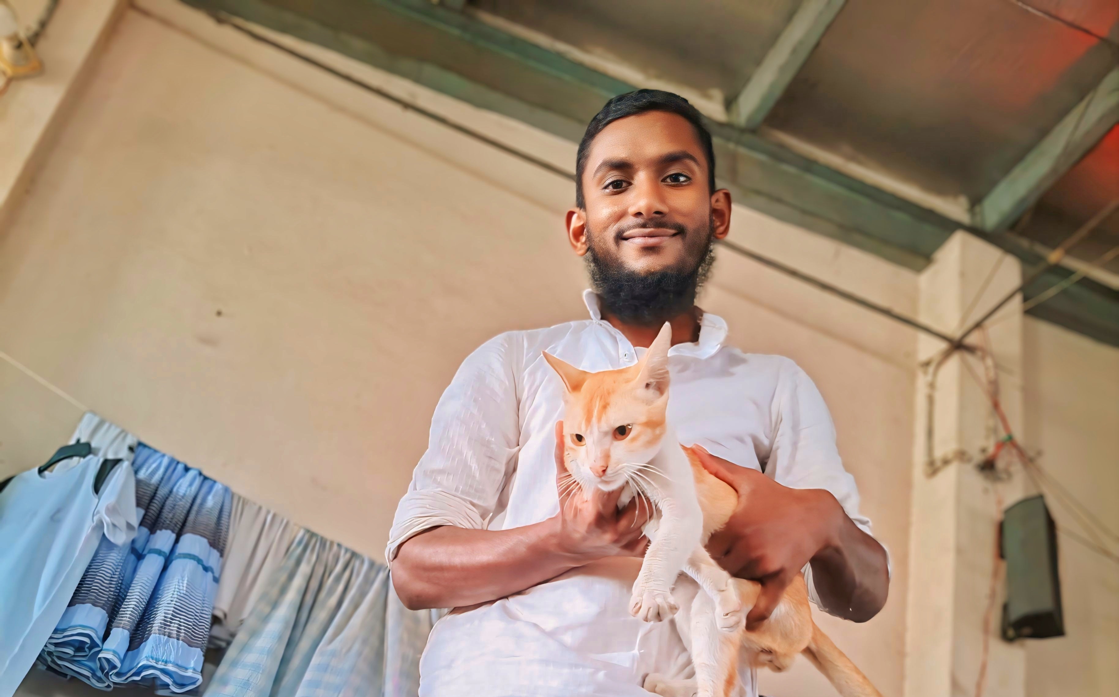 We will never hurt cats, we will always love cats, Hazrat Abu Hurairah (may Allah be pleased with him) loved cats very much. He used to love cats and keep them in his arms. Following the qualities of the Companions (may Allah be pleased with them) we can also love cats a lot. We will never hurt cats, if we can, we will feed them, if we can't, we won't hurt them, we will never trap cats, tie them up, or kill cats. I love playing with my pet cat, and my friend took this photo with my phone while I was petting the cat.