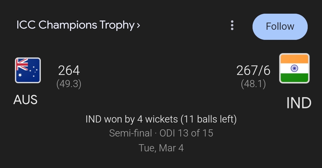 আইসিসি চ্যাম্পিয়ন্স ট্রফি ২০২৫-এর প্রথম সেমিফাইনালে ভারত ও অস্ট্রেলিয়া মুখোমুখি হয়েছিল। এক রোমাঞ্চকর লড়াইয়ে ভারত ৪ উইকেটে জয়ী হয়ে ফাইনালের টিকিট নিশ্চিত করে।