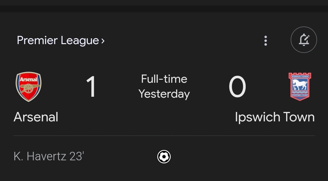 প্রিমিয়ার লীগের আরেক ম্যাচে মুখোমুখি হয়েছে আর্সেনাল বনাম ইফসুছ টাউন। এই ম্যাচে আর্সেনাল ১-০ গোলে জয় লাভ করে। ম্যাচের ২৩ মিনিটে আর্সেনালের হয়ে জয়সূচক গোল করেন Kai Havertz .আরসেলানের মোট শট ছিল ১৩ টি যার মধ্যে অন টার্গেট শট ছিল ৫ টি। বিপক্ষ দলের মোট শট ৩ টি থাকলে ও তাদের অন টার্গেট কোনো শট ছিলোনা। বল পজিশন ছিল আর্সেনালের ৬৮% আর বিপক্ষ দলের ৩২% .আর্সেনালের মোট পাশ ছিল ৬৭০ আর পাশ একুরেন্সি ছিল ৯০% .বিপক্ষ দলের মোট পাশ ছিল ৩১৮ আর পাশ একুরেন্সি ছিল ৮০% .আর্সেনালের ফাউল ছিল ৭ টি আর বিপক্ষ দলের ফাউল ছিল ১২ টি। উভয় দলের একটি করে হলুদ কার্ড রয়েছে। উভয় দলের কোনো লাল কার্ড নাই। আর্সেনালের একটি অফসাইড ছিল আর বিপক্ষ দলের অফসাইড ছিল ২ টি। আর্সেনালের কর্নার ছিল ৫ টি আর বিপক্ষ দলের কর্নার ছিল ১ টি।
